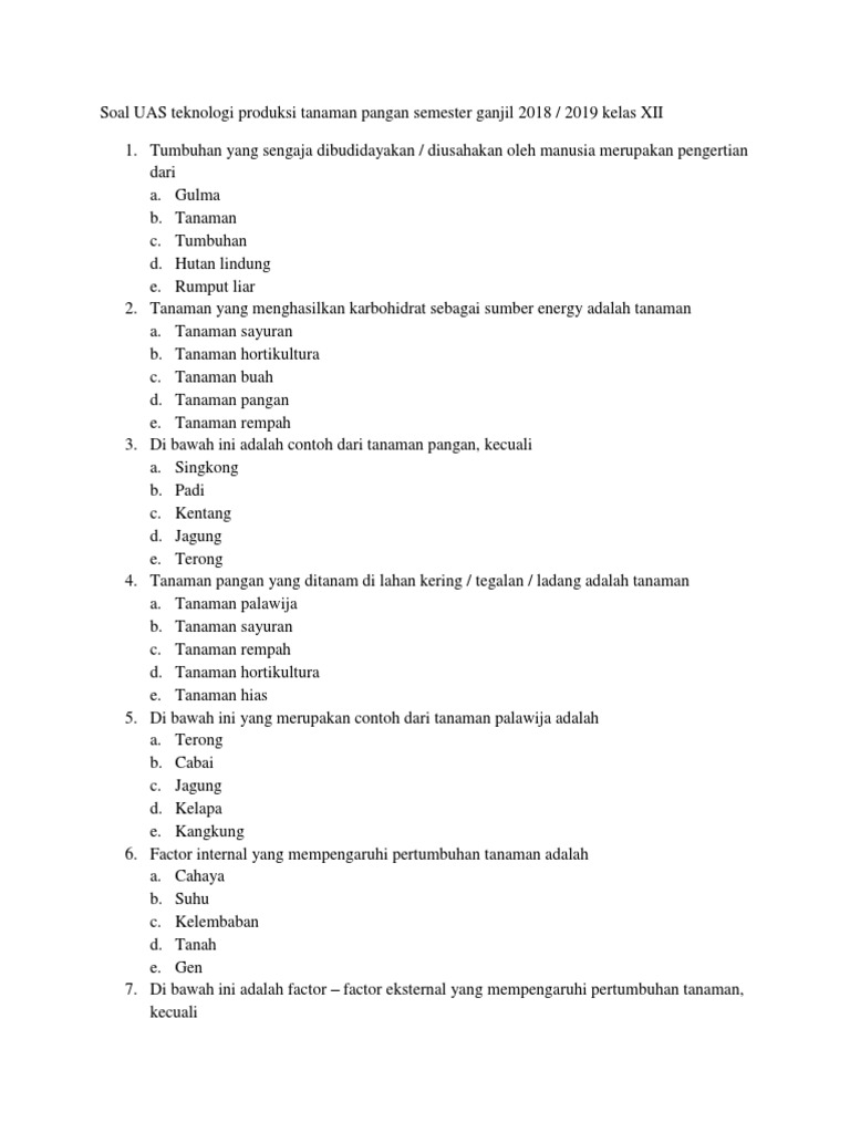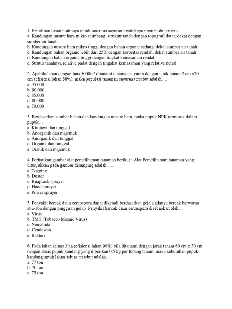 SOAL BUDIDAYA TANAMAN PERTANIAN KELAS X SMK kumpulan soal pertanian SOAL BUDIDAYA TANAMAN PERTANIAN KELAS X SMK PERTANIAN Berikut ini adalah soa soal pilihan ganda pelajaran budidaya tanaman Kabar Gembira Petani Dapat Ganti Rugi Rp 6 Juta Hektar Sumber. 2 x 45 menit a. 35 contoh soal pilihan ganda Dasar dasar akuntansi jawabanya jurusan akuntansi Kumpulan contoh Soal Bahasa Inggris Pilihan ganda Kelas 12 SMK Terbaru bagian 1 Contoh Soal Pilihan Ganda USBN Bahasa Indonesia 2019 Jawaban bagian 1.